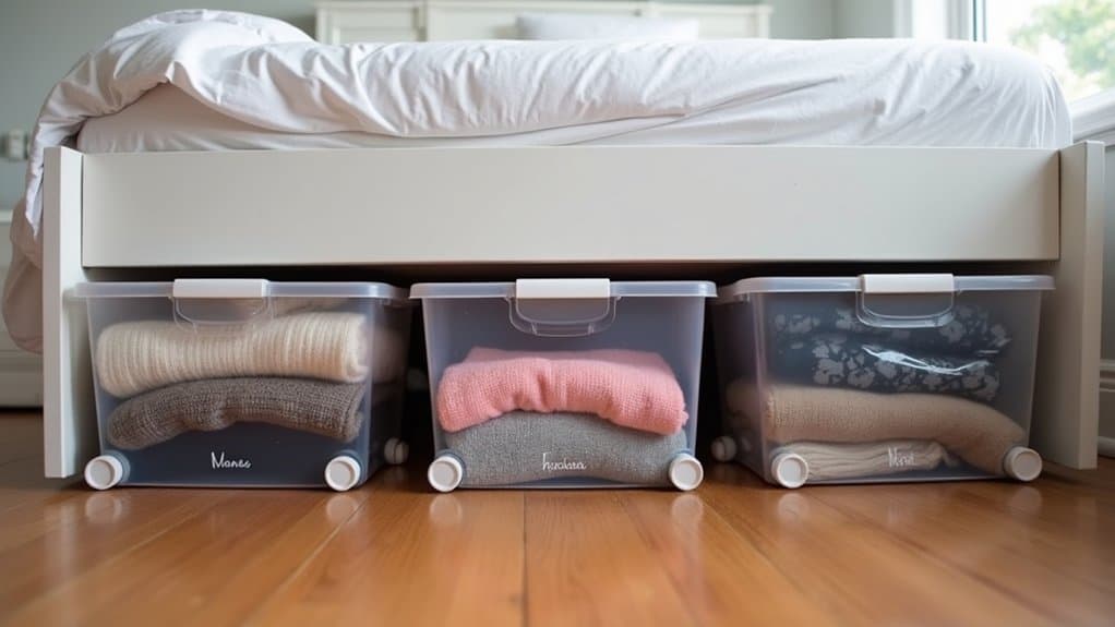 Under-bed storage is a practical solution for keeping seasonal clothing out of sight yet easily accessible. Start by selecting low-profile storage bins or bags designed to fit under your bed, ensuring they are durable and have clear labels for quick identification. Measure the space under your bed to guarantee the containers fit snugly without wasting valuable space.