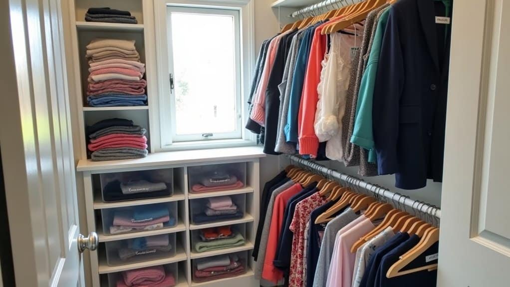 Rotating seasonal clothing is an effective way to keep your wardrobe organized and accessible throughout the year. Begin by sorting your clothing into categories based on the seasons, such as winter coats, summer dresses, or fall sweaters, and store off-season items in a designated space like under-bed storage or vacuum-sealed bags. This practice guarantees that only the clothing relevant to the current season is readily available, reducing clutter in your closet or dresser.