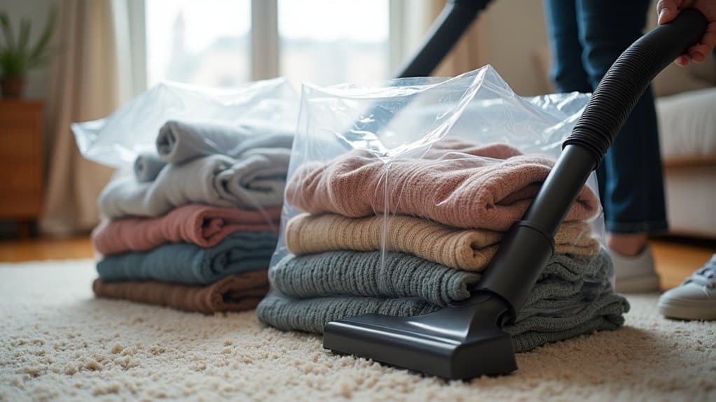 Once the clothes are in the bags, use a vacuum cleaner with a hose attachment to remove the air, or opt for hand-pump vacuum bags if you prefer a more manual approach. Seal the bags tightly after removing the air, and store them in a cool, dry place like a closet shelf or under the bed to keep them out of the way. Double-check the seals periodically to guarantee no air has seeped back in, as this could compromise the protection of your seasonal clothing.