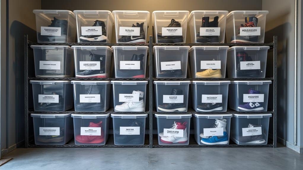Labeling shoe storage containers is a simple yet effective way to maintain order in your garage. Start by choosing clear containers or bins with lids to easily see the contents, and then use a label maker or adhesive labels to clearly mark each one with the type of shoes inside, such as “sneakers,” “boots,” or “sandals.” This approach guarantees that you can quickly locate the right pair without rummaging through multiple boxes.