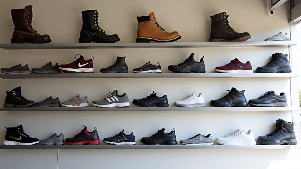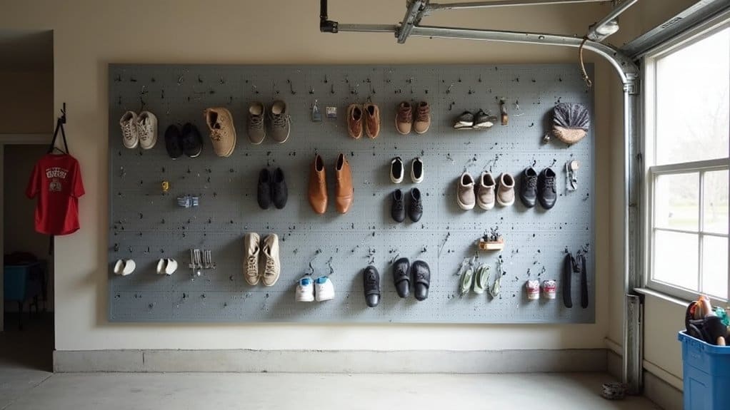 Pegboard shoe hooks are a versatile and space-saving solution for organizing shoes in your garage. Start by installing a pegboard on a wall in your garage, guaranteeing it is securely mounted to hold the weight of your shoes. Use pegboard hooks specifically designed for shoes or customize standard hooks to create holders that keep pairs together and easily accessible.