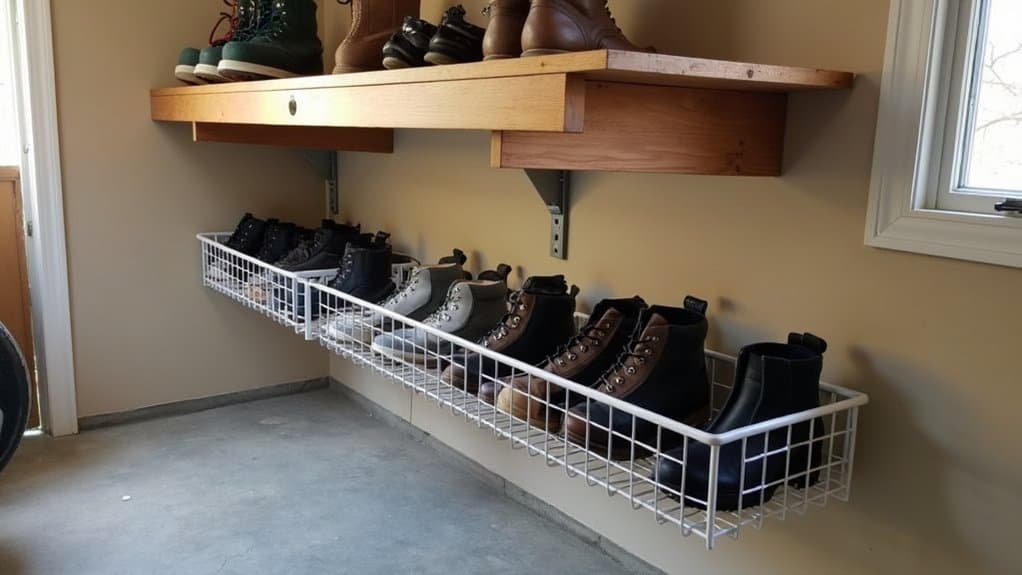 To install under-shelf baskets, start by measuring the space beneath your shelf to guarantee the basket fits snugly without obstructing other items. Securely attach the basket using the provided hooks or brackets, making sure it can bear the weight of the shoes you plan to store. This method not only keeps shoes off the ground but also creates a tidy, organized look in your garage.