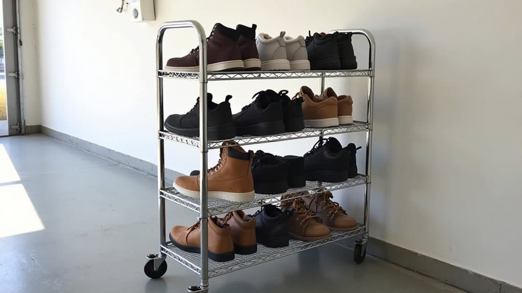 To maximize the use of a rolling shoe cart, place it in an accessible yet out-of-the-way spot in your garage, such as near the entry door or along a wall. Organize shoes by frequency of use or type, keeping everyday footwear on the top shelf for quick access and seasonal or less-used pairs on lower tiers. Make certain the cart is stable and on a flat surface to prevent tipping, and consider locking wheels if available to keep it securely in place.