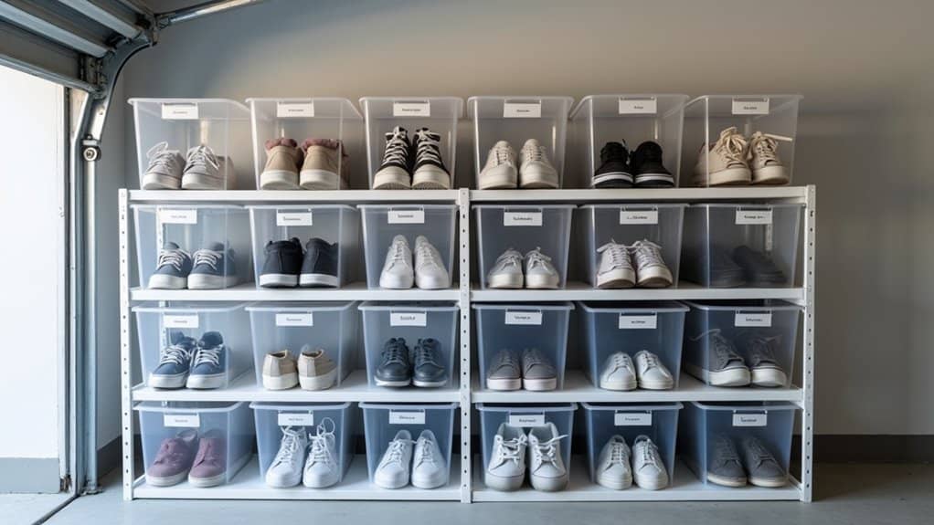 Stackable shoe bins are an excellent solution for keeping your footwear organized in the garage, maximizing vertical space while protecting shoes from dust and dirt. Start by selecting clear, durable plastic bins that allow you to see the contents easily, and guarantee they are stackable with secure lids to prevent slipping. Place the bins on a sturdy shelf or directly on the floor, grouping shoes by type or owner for quick access.