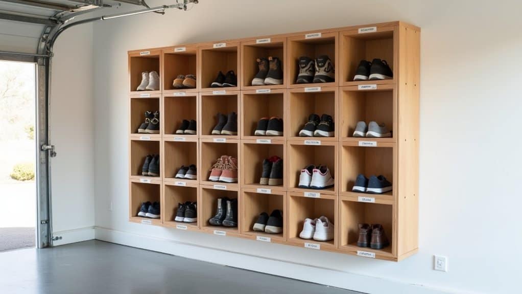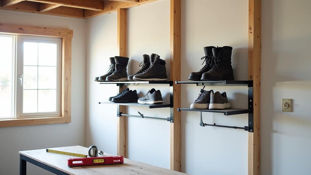 Installing wall-mounted racks in your garage is an effective way to keep shoes organized and off the floor. Begin by selecting a suitable wall space that is easily accessible and away from heavy tools or equipment to avoid damage. Use a stud finder to locate secure mounting points, then install the racks with sturdy screws or anchors to guarantee they can hold the weight of multiple pairs of shoes.