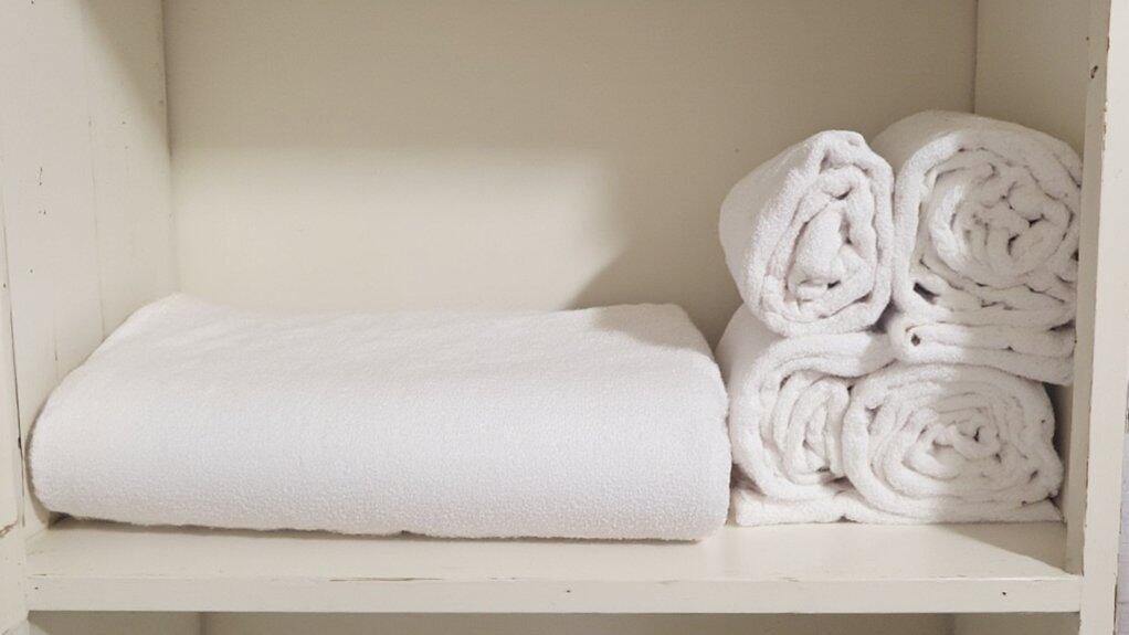 Folding towels uniformly is a key step in maintaining an organized and visually appealing closet. Start by laying the towel flat on a clean surface, smoothing out any wrinkles to guarantee a neat base. Then, fold the towel into thirds lengthwise, followed by folding it into thirds or halves widthwise, depending on the size of your storage space, to create a compact, stackable shape.