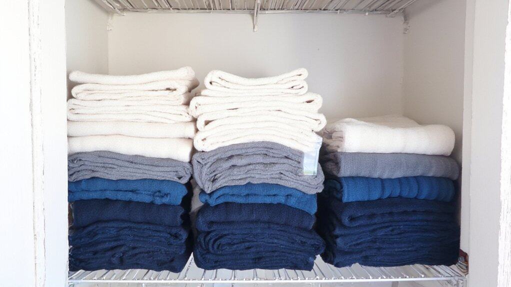 Labeling towel categories is an effective way to maintain an organized closet and guarantee everyone in the household knows where to find or store specific types of towels. Start by sorting your towels into distinct groups, such as bath towels, hand towels, washcloths, and beach towels, based on their purpose or size. Then, create clear, easy-to-read labels for each category using label makers, sticky notes, or even handwritten tags attached to shelves or bins.