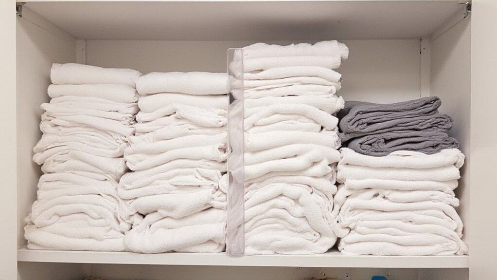 To use shelf dividers effectively, first categorize your towels by type—bath towels, hand towels, and washcloths—or by family member if sharing the closet space. Place the dividers on the shelf to create distinct sections for each category, ensuring towels remain neatly stacked and accessible. This method prevents towels from toppling over and keeps your closet looking tidy and organized.