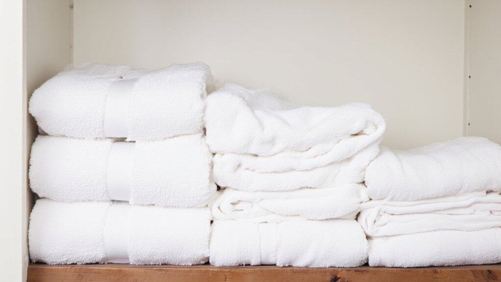 Let’s just say keeping your towels in order isn’t a Herculean task, and I’m thrilled to share some clever tricks! I’ve wrestled with messy closets myself, and trust me, a tidy stack feels like a small victory. You can transform chaos into calm by folding towels uniformly—aim for a neat 12-inch by 24-inch rectangle. Curious how to stack ‘em right? Stick with me for the next step!