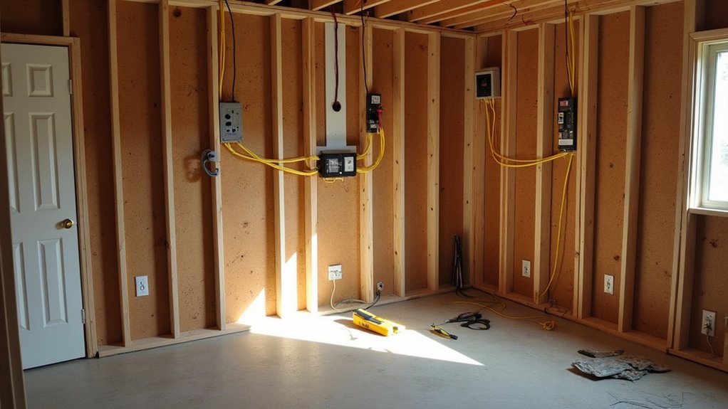 Start by planning your outlets and switches. You’ll need at least two outlets per wall, spaced 12 feet apart, using 14-gauge wire for standard circuits. Grab a voltage tester—cheap at $10!