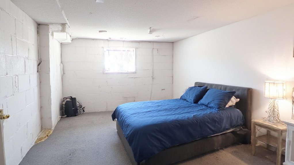 Hey there, let’s plunge into turning that dreary basement into a cozy bedroom, but first, we’ve gotta tackle some prep work! Man, I’ve botched this before—trust me, skipping steps is a disaster! Start by checking for dampness; basements can be sneaky with moisture.