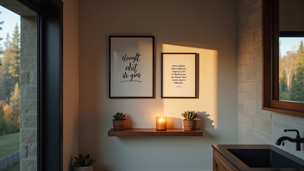Start with small, framed prints—think 8×10 inches—of calming landscapes or quirky quotes. Hang them at eye level, about 60 inches from the floor, using damage-free adhesive hooks.