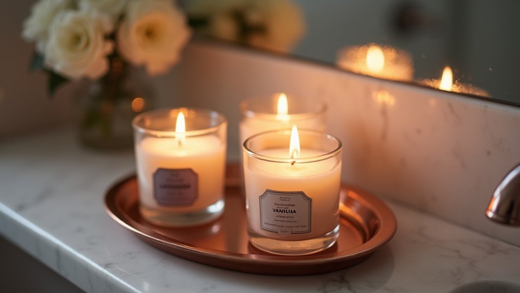 Pick candles with scents like lavender or vanilla—trust me, they’re instant relaxation in a jar! Place 2-3 small, 3-inch diameter candles on a heat-safe tray near the sink or tub. I once knocked one over—wax everywhere! Disaster!