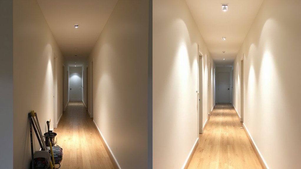 Hey, let’s brighten up that dark hallway together—I’ve stumbled through enough DIY disasters to know the tricks! Start by sizing up your hallway lighting situation, then grab some bright wall sconces, reflective mirrors, light-colored paint, and LED ceiling lights to transform the space. Man, I can’t wait to see your gloomy corridor turn into a cheery path—trust me, it’s gonna be awesome!