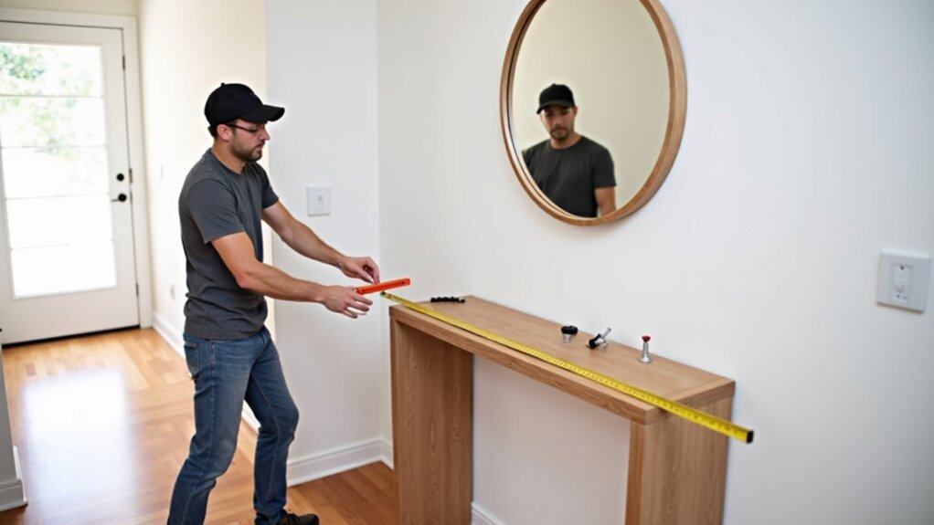 Pick a slim console table—about 30-36 inches wide and 12-15 inches deep—to fit tight spaces. Place it under the mirror, centering it with a tape measure. Secure it to the wall if you’ve got wobbly floors like mine!
