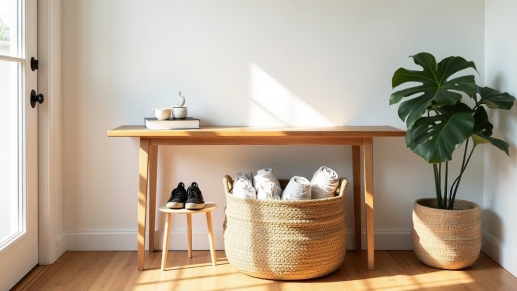 First, pick the right spot. Place your basket under that console table we set up—mine’s a 15-inch wide, woven seagrass one from Target ($20, score!). It’s perfect for hiding shoes or scarves.