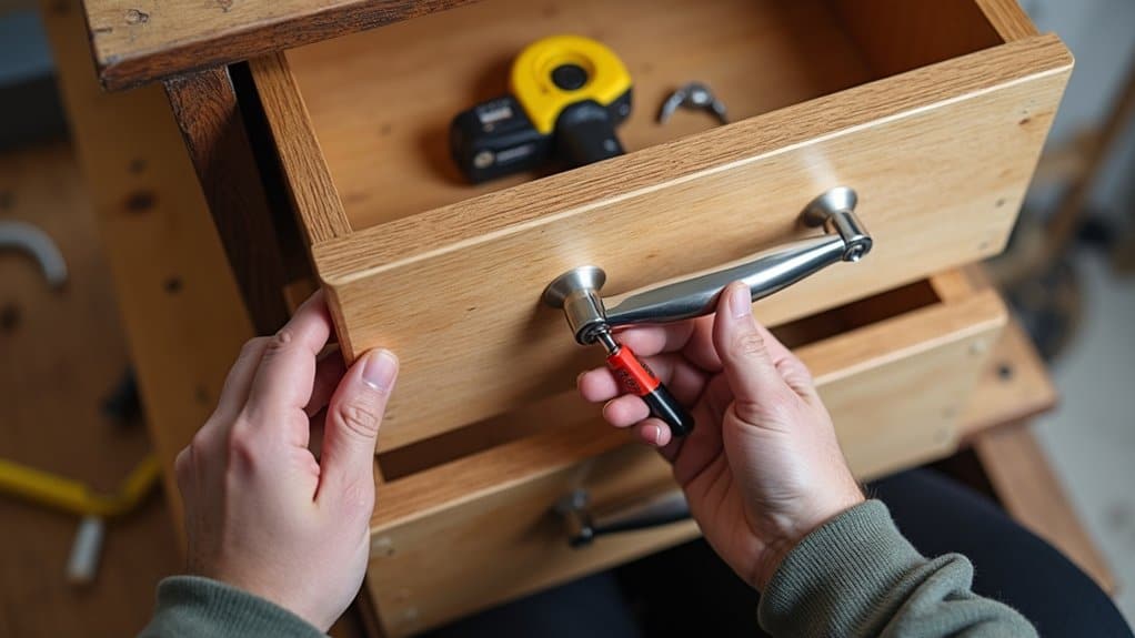 First, grab your handles—mine are 5-inch stainless steel ones from the hardware store. Position them 2 inches from the drawer’s top edge. Mark the screw holes with a pencil.