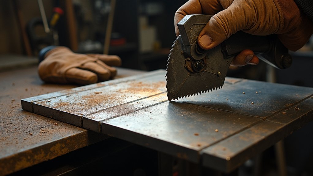 First, grab your steel—make sure it’s 1/8 inch thick high-carbon steel for durability. Use a hacksaw or angle grinder with a metal-cutting disc.
