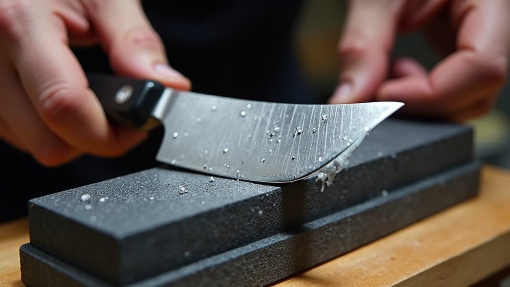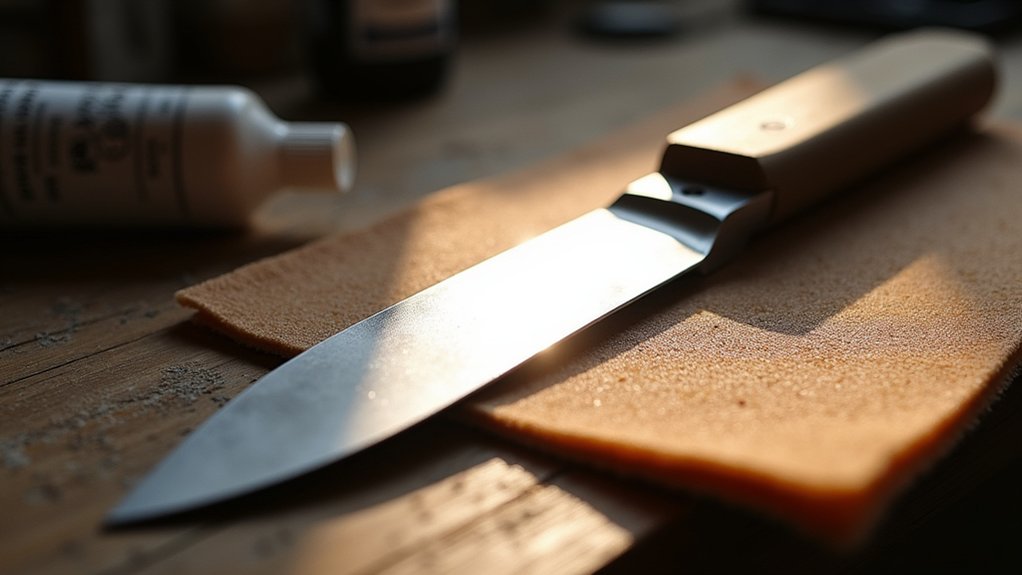 Grab some sandpaper—start with 400 grit and move to 1000 grit. Wet the paper, then rub the blade in small circles. Watch scratches vanish!