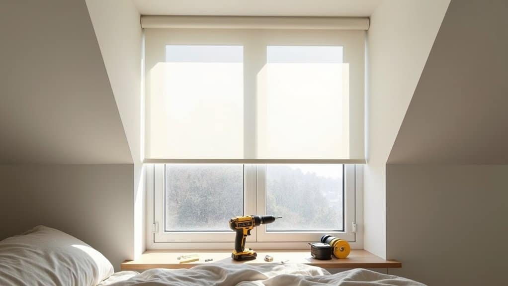 Next, pick blinds—go for blackout roller blinds from a store like Home Depot. Install them by: