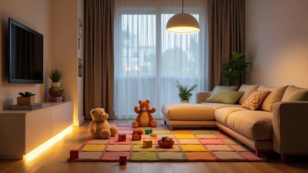 Start with LED nightlights—plug in two, about 3 feet apart, along baseboards. They’re low-wattage (under 5 watts) and kid-safe with soft glows. Next, hang a colorful pendant light (18-inch diameter max) over the play area—use a low-heat bulb (LED, 40 watts). Secure it 7 feet high to avoid head bumps. Wow, it’s looking brighter already! What a transformation!