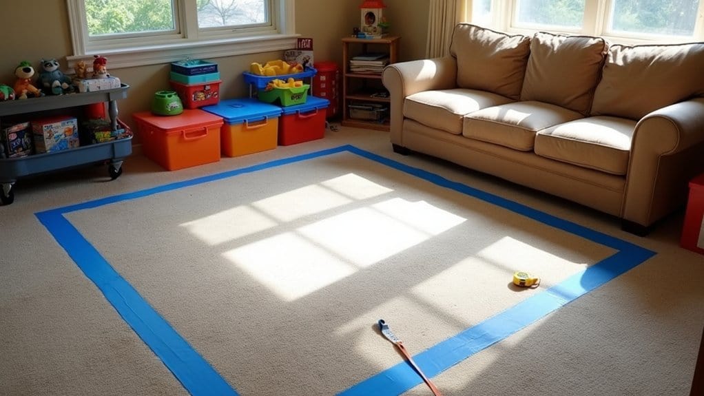 Start by picking a corner or wall section, ideally 6×6 feet, for your play area. Measure it out with a tape measure! Use painter’s tape to mark boundaries on the floor. It’s cheap at about $5 a roll and won’t wreck your flooring. Wow, look at that—your play space is taking shape already!