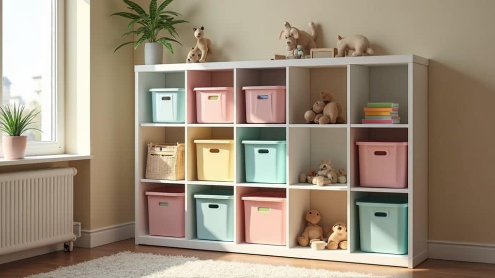 Next, organize by type—cars in one bin, dolls in another. Label ‘em with cute stickers! Finally, secure heavier units to the wall with anchors; I once dodged a falling shelf—total DIY fail! Keep it tidy, and you’ve got a win for playtime!