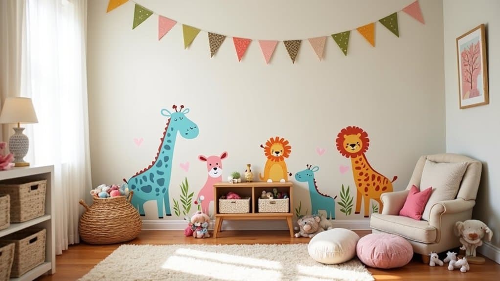 Start with wall decals; they’re easy stickers for instant flair. Grab a pack of 24-inch jungle animal decals from any craft store, and stick ‘em up at kid-eye level, about 3 feet high.