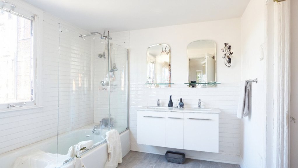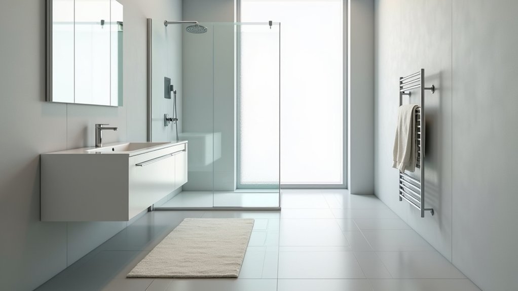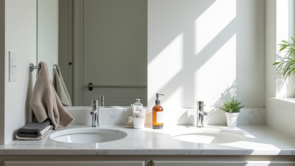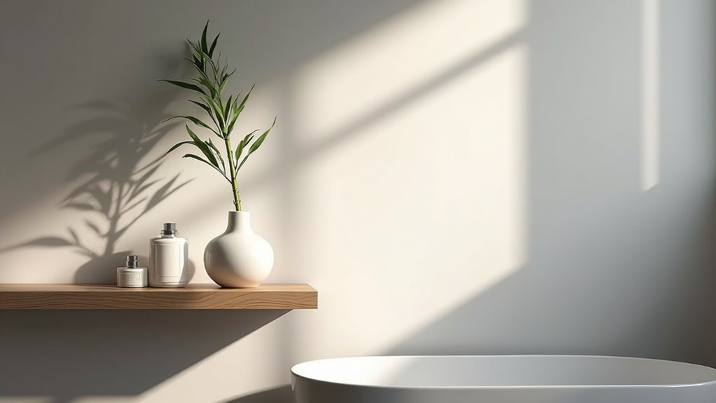 While reflective tiles can work magic, let’s switch gears and talk about using minimalist decor accents to keep your small bathroom feeling open and airy. I’ve learned the hard way—too much stuff makes a tiny space chaotic! Trust me, less is more.