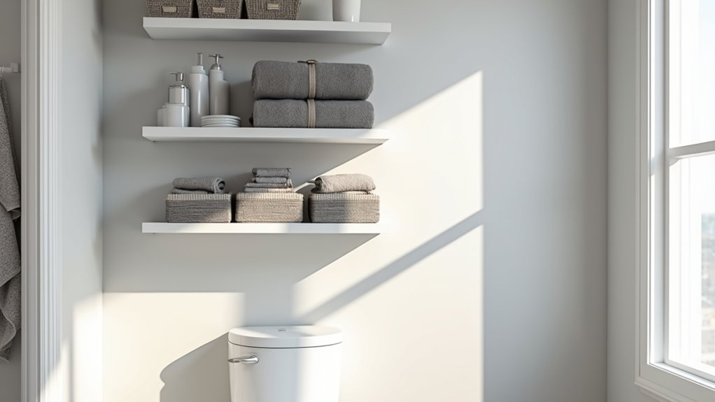 Start with wall-mounted shelves. Grab a set of 12-inch deep floating shelves from a local store—about 36 inches long. Install them above your toilet, 6 inches apart, for towels and baskets.