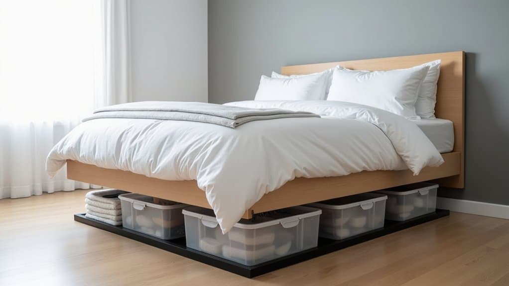 Next, store stuff in under-bed bins—think 14”x30” clear ones from Target. It’s a lifesaver! I once stuffed mine with old shoes—total rookie move—but now, it’s pure magic for extra room!