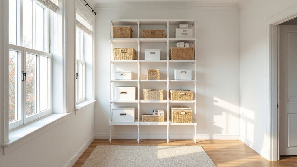 Start by installing tall shelves. Grab a 72-inch high, 30-inch wide unit from a store like IKEA. Secure it to the wall—don’t skip studs!
