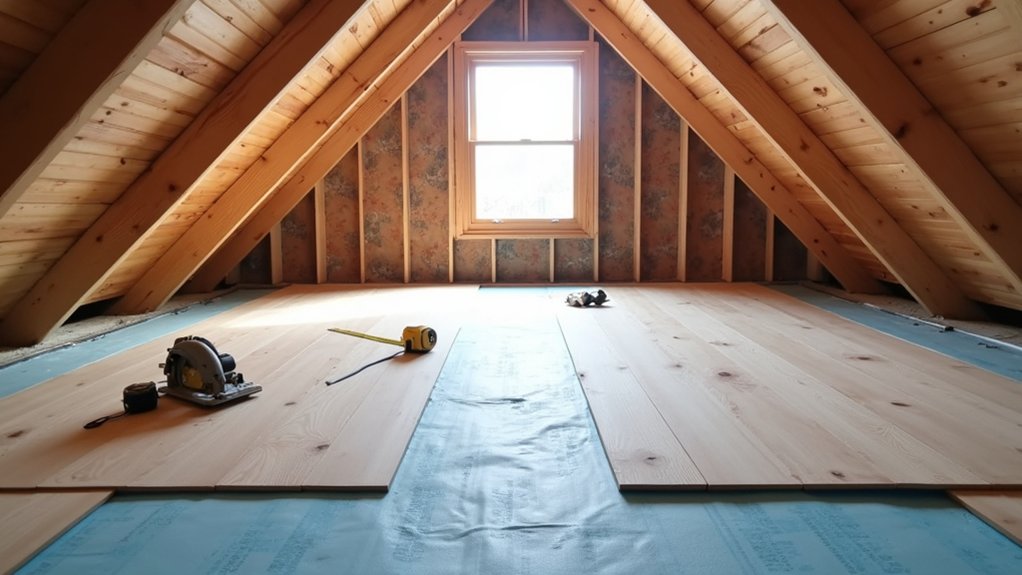 Now that you’ve got a solid grasp on your attic’s condition, let’s move to planning the bedroom layout. This step guarantees your space feels functional and cozy. Start by measuring the floor area—most attics are 10×12 feet or smaller, so precision matters.