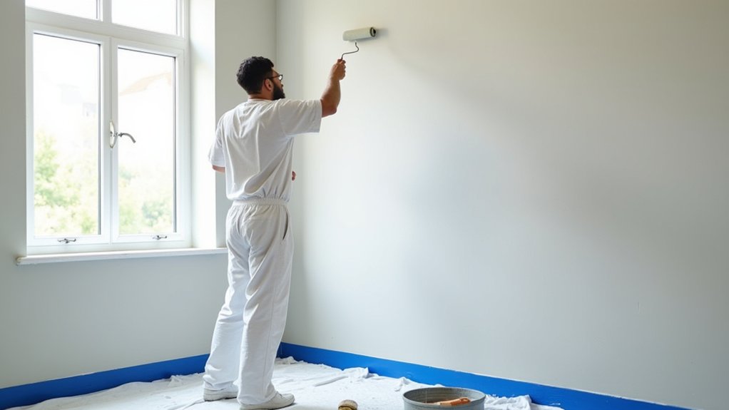 - Apply painter’s tape to edges; it takes 10 minutes per wall.