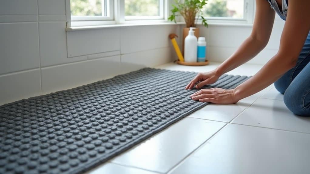 First, pick the right stuff. Go for textured vinyl or rubber mats with a gritty surface, about 1/8-inch thick, covering at least 3×3 feet near wet areas.