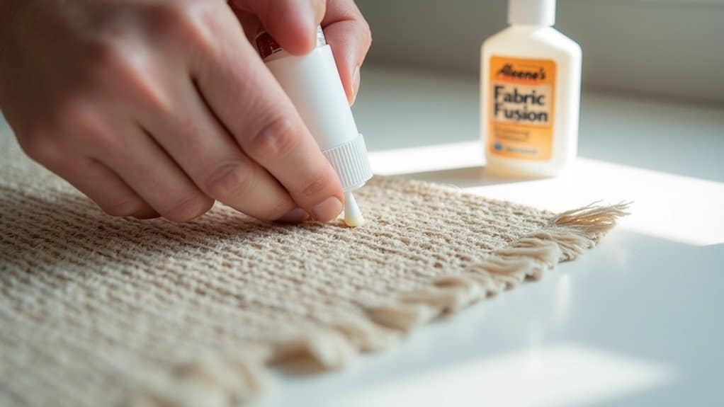 Start by grabbing some fabric glue or a sewing kit. If you’re gluing, apply a thin line of Aleene’s Fabric Fusion along each edge, about 1/4 inch wide. Press it down hard! Or, sew a tight zigzag stitch with a needle and thread, 1/8 inch from the edge. Either way, secure it tight—don’t let your hard work slip away! Wow, that’s satisfying!