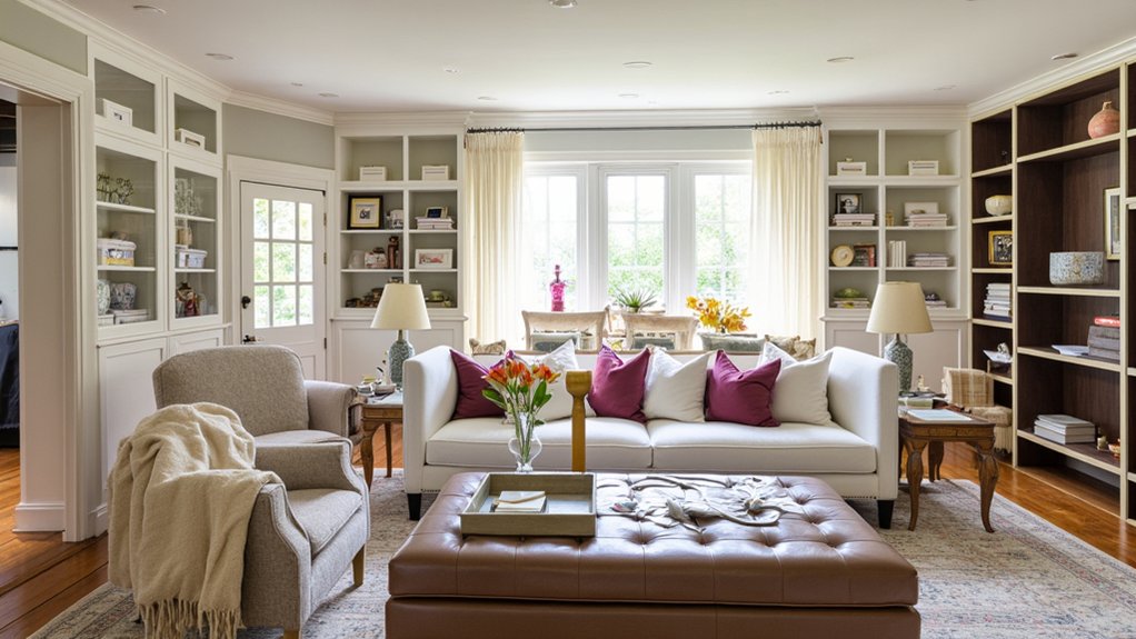 While formal living rooms often lack practical storage, you can seamlessly integrate attractive solutions that maintain the room’s elegance while hiding everyday items.