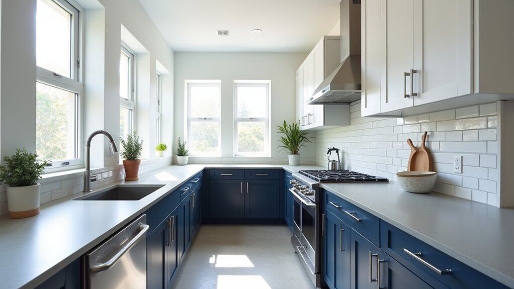 Start with a light base—think creamy white walls (try Behr’s “Polar Bear”) to bounce light around. Then, add pops of color! Use navy blue cabinets (about 36 inches high) for depth. I once spilled blue paint everywhere—such a mess, ha!
