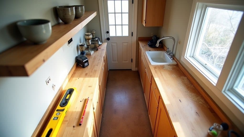 Next, add floating shelves above—12 inches deep—for extra storage. Trust me, you’ll love the breathing room! Measure twice, though; I messed up once and had to redo everything! Ugh!