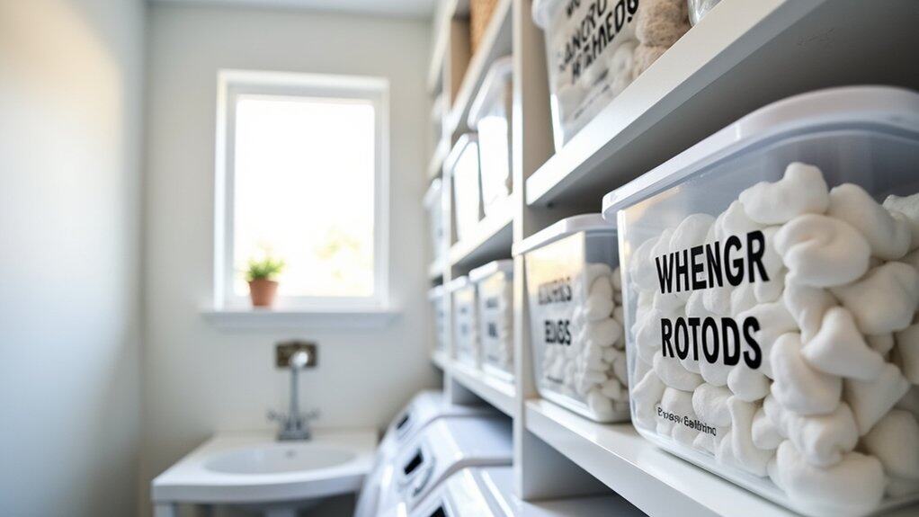 Labeling storage containers in your laundry room is a simple yet effective way to maintain organization and save time. Start by identifying the contents of each container, whether it’s detergent, fabric softener, dryer sheets, or miscellaneous items like clothespins. Use clear, legible labels with bold text or colors to guarantee they’re easy to read at a glance, even in a dimly lit space.