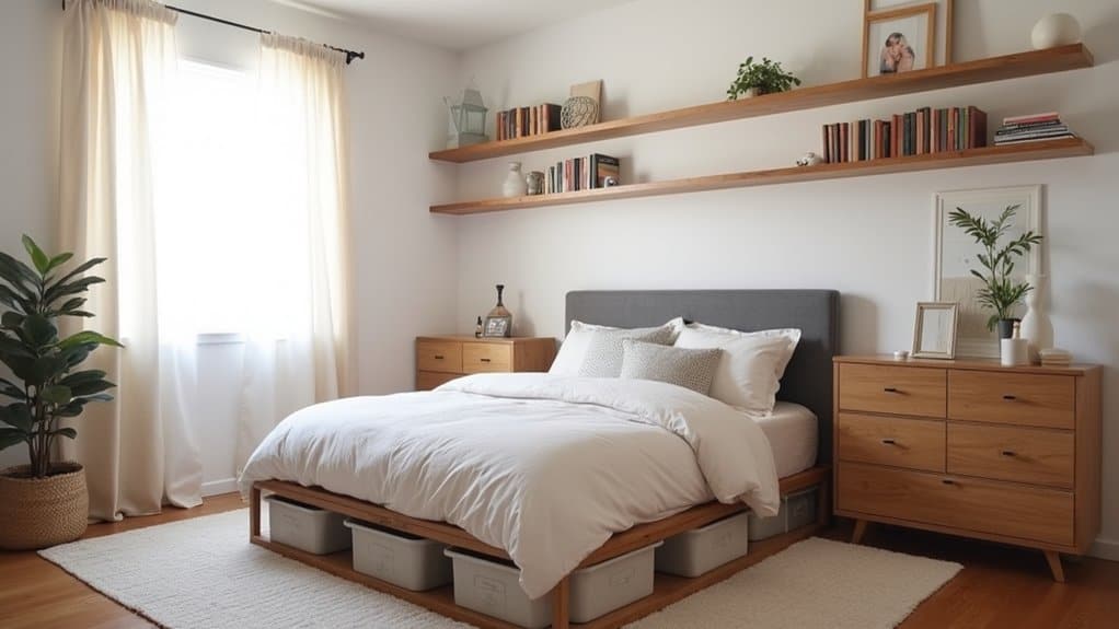 Start with multi-use furniture. Grab a bed frame with built-in drawers—think 60-inch wide ones like the IKEA Malm (around $200). Stash clothes there!