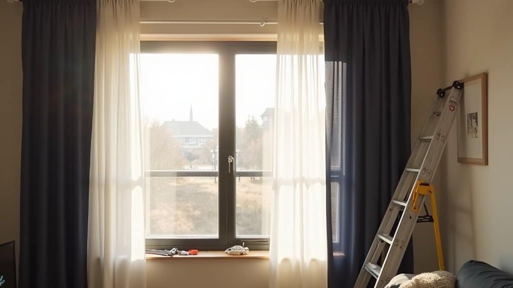 First, measure your windows—grab a tape measure for exact width and height. Use blackout curtains (like 84-inch Eclipse panels) for privacy and sleep.