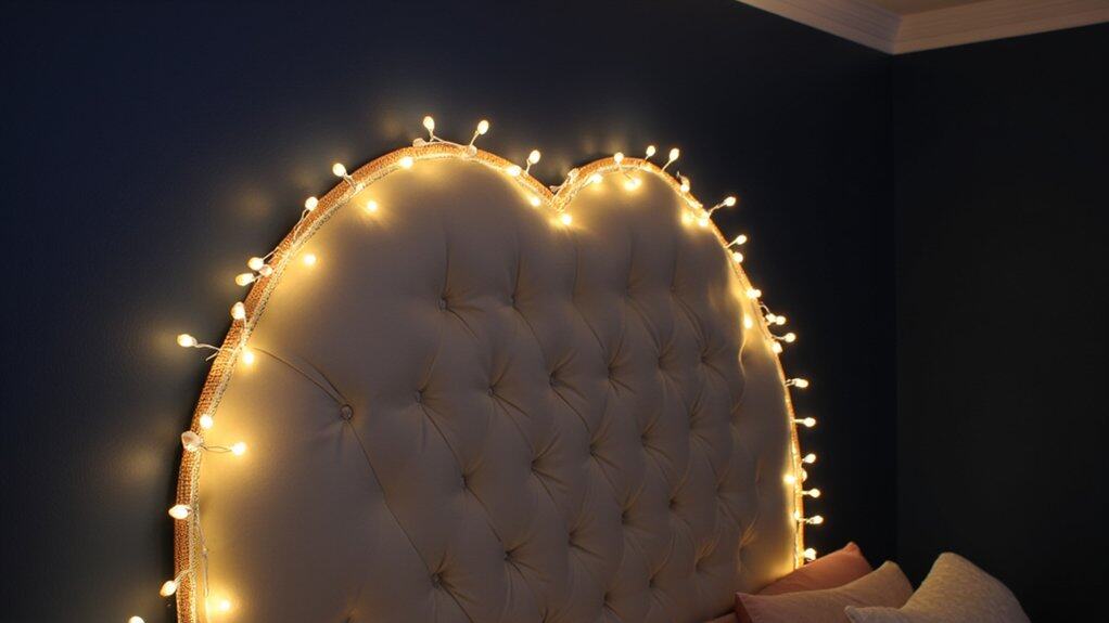 Let’s shift focus from the glowing warmth of a fireplace to another charming touch with dimmed fairy lights. You’re creating a magical vibe that’ll make your bedroom feel like a cozy escape. String these lights carefully for the perfect effect.