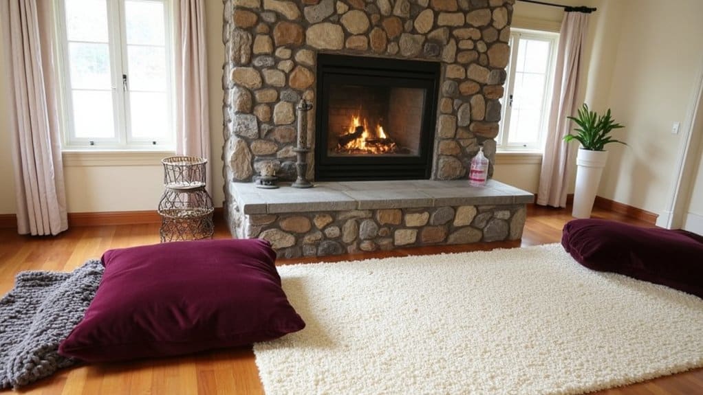- Arrange a Soft Spot: Place a plush rug (at least 5×7 feet) and two pillows near the hearth.