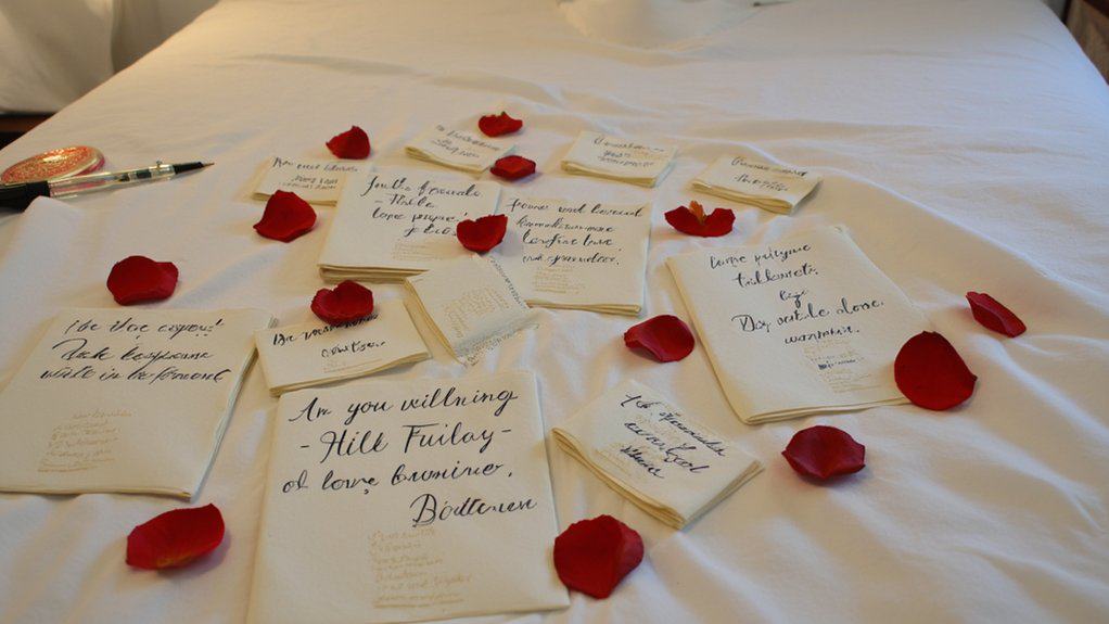 After setting the musical tone, let’s add a heartfelt touch to your romantic bedroom with personalized love notes. These small gestures can make a big impact if you’re strategic.
