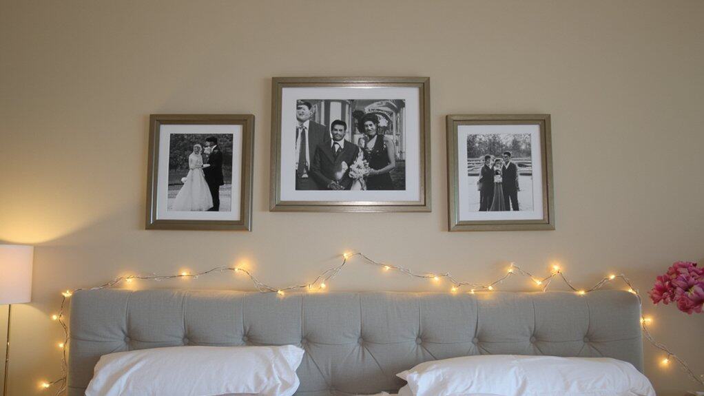 While a soothing scent sets the tone, adding romantic wall art can truly personalize your bedroom’s charm. You can transform the space with meaningful touches that speak to your shared memories.