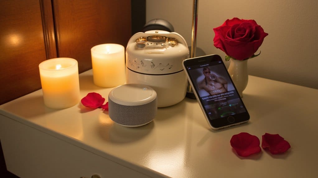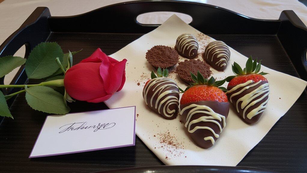 As you craft a romantic bedroom, don’t overlook the power of small, indulgent touches like luxurious chocolate treats. These can elevate the mood with a sweet surprise. Set up a small bedside tray (about 12×8 inches) with treats ready by 8 PM.