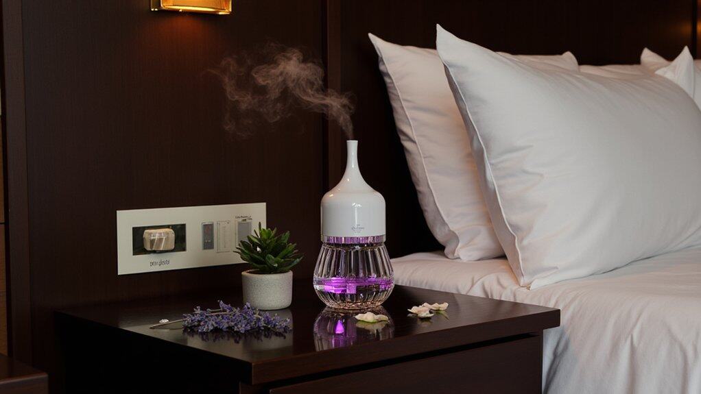 Beyond the allure of silky bedding, adding a scented aromatherapy diffuser can elevate your bedroom’s romantic ambiance. You can transform the space with soothing scents that linger. Place a diffuser, about 6-8 inches tall, on a nightstand for best effect.