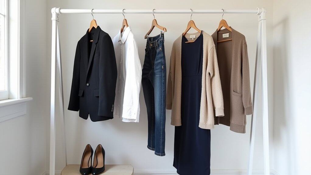 Prioritize items that suit multiple seasons and occasions to maximize their utility in your wardrobe. Think about layering options like cardigans or lightweight jackets that adapt to changing weather while maintaining a polished appearance. By investing in these foundational pieces, you guarantee a functional and timeless wardrobe that simplifies daily outfit decisions.