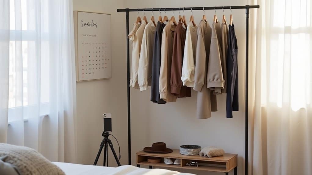 To effectively limit seasonal pieces, store off-season items in a separate space, such as under-bed storage or a designated closet area, to keep your active wardrobe clutter-free. Rotate these pieces as the seasons change, ensuring you only have access to what is relevant for the current weather. This approach not only saves space but also keeps your daily outfit choices simple and focused.